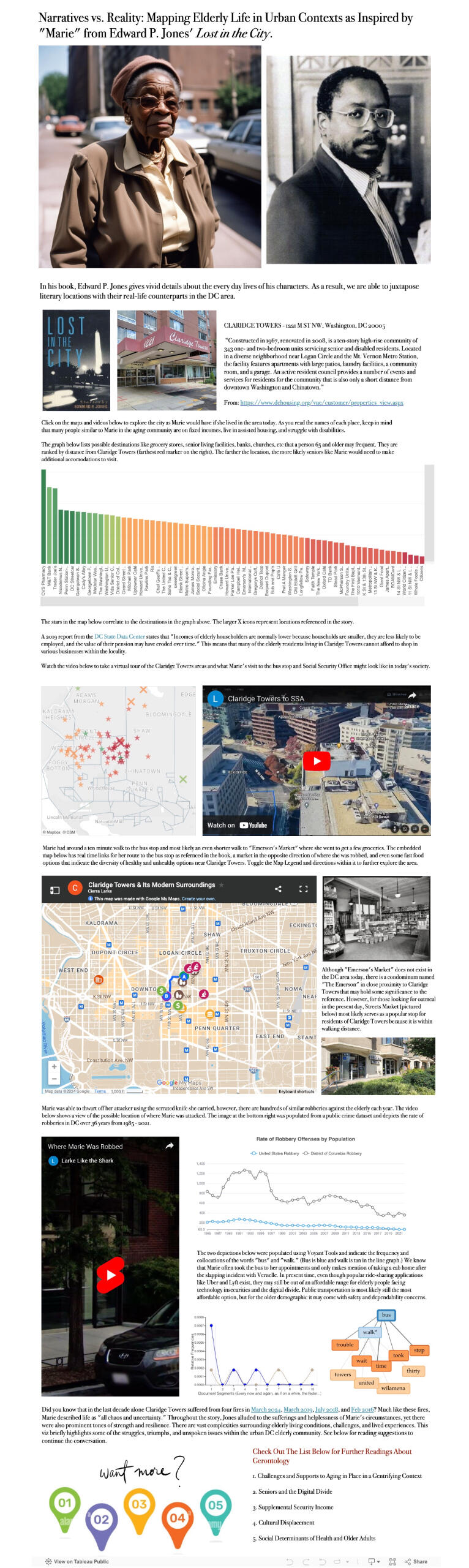 This was one of my most recent projects and served as a visualization to highlight and juxtapose literary elements and real-life. I did not use any image editing software to create this, but I combined various open source software like Google maps, Google Earth studio, and Voyant Tools. When viewed on Tableau Public or Desktop, the map points interact with the bar chart to filter location names related to the content. This is one of my favorite pieces because I think the natural white space forms a neat grid and thus speaks more volume aesthetically versus an overcomplicated background or layout.